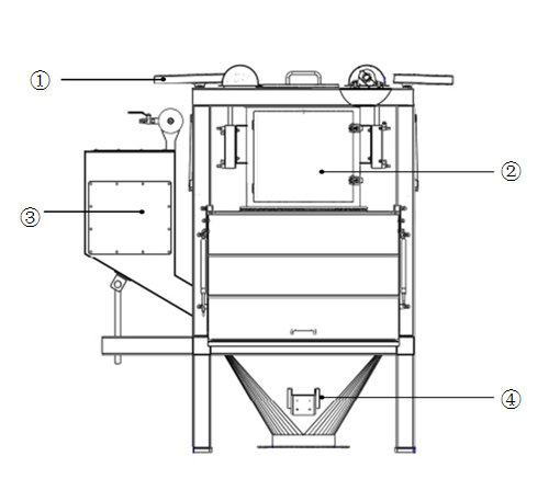 ①拍打裝置?? ②受料倉組件?? ③收塵組件?? ④投料站倉體