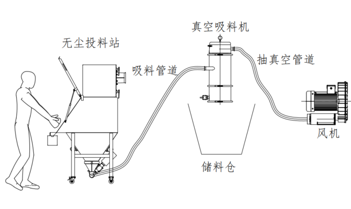 無塵投料站的工作原理是投料時(shí)產(chǎn)生的物料粉塵被離心風(fēng)機(jī)或抽氣管道形成的負(fù)壓吸到過濾系統(tǒng)中,使物料與空氣分離,防止粉塵四散逃逸、污染周圍環(huán)境和保護(hù)操作者身體健康。